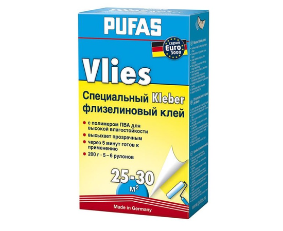 Клей флизелиновый EURO 3000 PUFAS используется для наклеивания обоев на флизелине путём нанесения клея на стену, а также для наклеивания других обоев традиционным способом, т.е. нанесения клея на обои. Область применения: для наклеивания флизелиновых обоев новым способом, т.е. нанесения клея прямо на стену для наклеивания других видов обоев таких как бумажные, виниловые, с древесным волокном под покраску, текстильные, шелкографные и т.п. для наклеивания на все минеральные основания, а также гипсокартонные плиты.