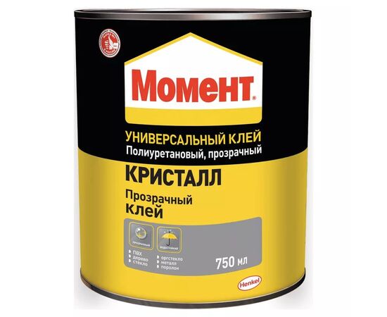 Клей универсальный Момент Кристалл разработан для склеивания поливинилхлорида, дерева, резины, стекла, фарфора и керамики. Удобно наносится и прочно склеивает поверхности. Для того, чтобы клей хорошо взялся, необходимо сильное кратковременное давление. Максимальная прочность достигается через 3 дня в зависимости от материала и силы нажатия при склеивании. Клей не содержит резкого запаха и устойчив к влаге. Объем 750 мл.