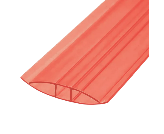 Неразъемный соединительный профиль изготавливается для соединения двух листов поликарбоната со стороны торцевых краев. Подходит для соединения листов толщиной 10 мм. Используется в прямых и криволинейных конструкциях, так как вместе с панелями поликарбоната может сгибаться до минимального допустимого радиуса. Представляет собой цельную Н-образную планку с загнутыми внутрь краями. С обеих сторон планка имеет пазы, в которые и вставляются листы поликарбоната. При необходимости пазы могут быть дополнительно смазаны герметиком. Неразъемный профиль закрепляется на каркасе саморезами, которые могут быть укреплены термошайбой.