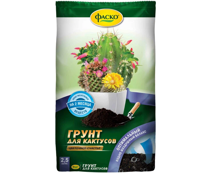 Грунт для кактусов Фаско «Цветочное счастье» - специальный грунт, имеющий в себе полезные биологические добавки и удобрения, стимулирующие здоровый рост и развитие кактусов. Также может быть использован вместе с какими-либо удобрениями. Грунт рыхлый, в меру увлажненный. После пересадки следует полить кактус и убедиться, что процесс пересадки прошел правильно. Безопасен при правильной эксплуатации.