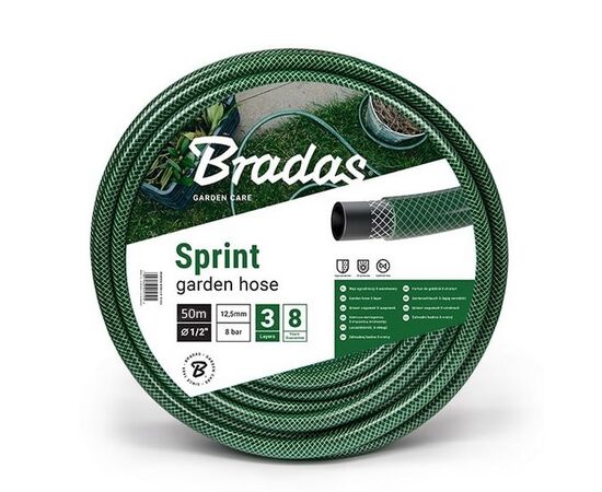 Шланг для полива SPRINT 1/2" 50 м - трехслойный, армированный шланг, произведенный в Италии под торговой маркой польской фирмы BRADAS. Стандартный поливочный шланг с сетчатой оплеткой, устойчив к УФ, не трескается, не истирается. Цвет - зеленый. Изготовлен из мягкого ПВХ.