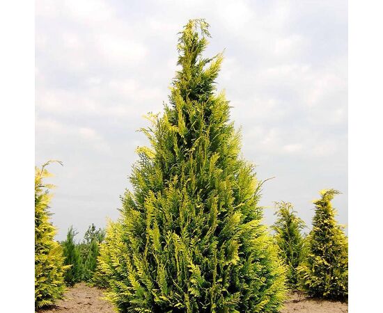 Вечнозеленое хвойное дерево, вырастающее до 2,5 м к 10 годам. Форма кроны правильная коническая, ветви прямые, веерообразно растущие. Хвоя чешуевидная, золотистая или желтая, в тени становится салатовой. Предпочитает легкие плодородные почвы, умеренно влажные. Чувствителен к зарастанию и задернению приствольного круга, требует рыхления. В ландшафтном дизайне используется обычно в качестве цветового элемента в коллективных посадках.