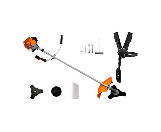 Заправляется смесью из масла для двухтактных двигателей и бензина А92. Корпус изготовлен из высококачественных материалов, за счет чего устойчив к механическим повреждениям. Низкий уровень вибрации, удобная рукоятка и двойной плечевой ремень делают использование косы максимально комфортным. В комплекте поставляется металлический нож и триммерная головка.