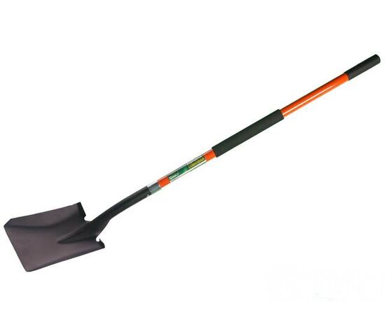 Лезвие изготовлено из высокоуглеродистой закаленной стали с защитным антикоррозийным покрытием. Фиберглассовый черенок с прорезиненной рукояткой. Ширина полотна: 235 мм, Высота полотна: 550 мм, Длина лопаты с черенком: 1480 мм. Толщина полотна 1,75мм