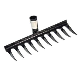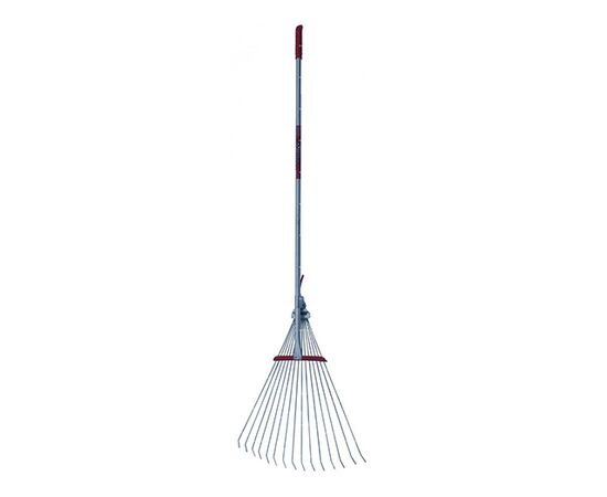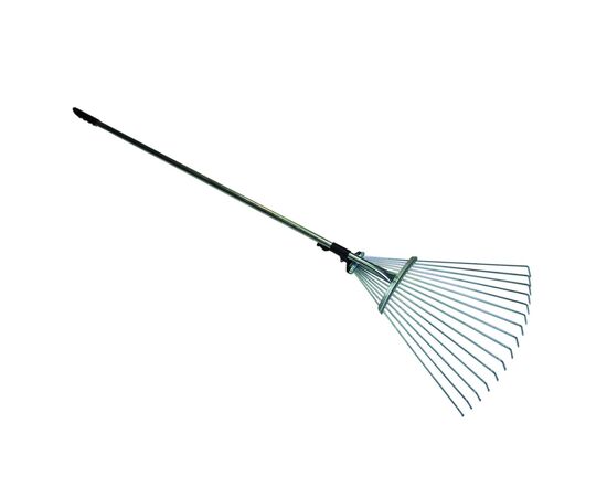 Конструкция рабочей части - раскладная, фиксатор - цанговый, пластиковый. Тип граблей - веерные проволочные, кол-во зубьев - 15. Ширина в разложенном виде - 550мм.