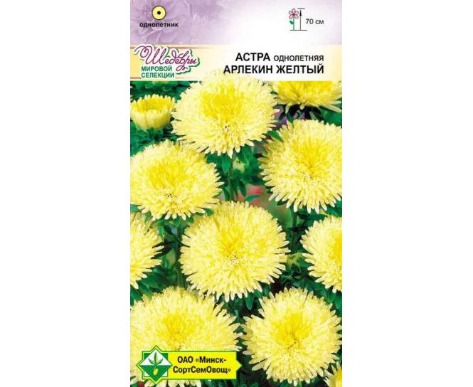 Новейший оригинальный срезочный сорт. Среднего срока цветения. Куст пирамидальный, прочный, высотой 65-70 см. Соцветия махровые, желтые с более яркой серединкой, в диаметре 6-8 см. Одно растение формирует 10-14 побегов, которые можно срезать у основания как один большой букет. Семена на рассаду высевают с конца марта до середины апреля (с конца апреля возможен посев непосредственно в грунт). Рассаду высаживают в мае.