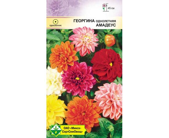 Георгина Амадеус относится к однолетним ранним сортам с крупными махровыми цветками. Растет компактным кустом высотой 30—40 см. Бутоны шаровидной формы, до 10 см в диаметре, разнообразных ярких окрасок. Одинаковые многочисленные краевые лепестки коротко-овальной формы, на концах свернуты в трубку, расположены концентрическими кругами. Предпочитает солнечное, защищенное от ветра место, с хорошей циркуляцией воздуха. На рассаду семена высевают в начале апреля. В открытый грунт высаживают в начале июня после окончания заморозков на расстоянии 20—25 см. Требуют умеренного полива. В упаковке — 0,3 грамма семян.