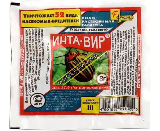 Инсектицид кишечно-контактного действия, эффективен против различных видов вредителей садовых растений (колорадского жука, вишневой мухи, морковной мухи, плодожорки, долгоносика, чайной моли, грибных комариков и др.) и комнатных цветов (трипсов, всех видов тли, белокрылки). Инта-вир уничтожает 52 вида вредителей.