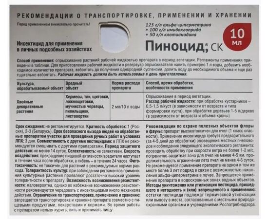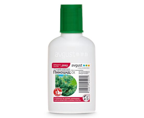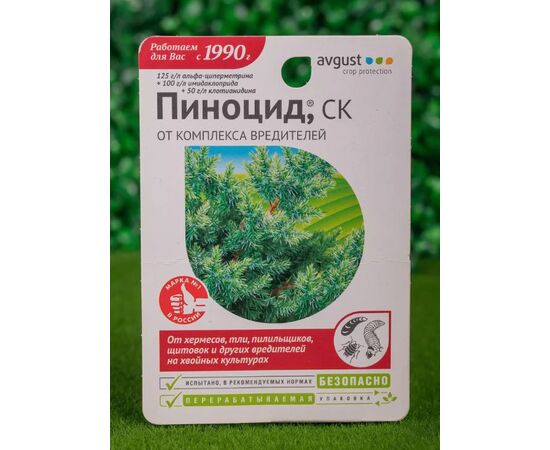 Пиноцид — высокоэффективный системный препарат для защиты хвойных культур от широкого спектра вредителей, таких как хермесы, тли, пилильщики и щитовки. Уникальное сочетание трёх действующих веществ из разных химических классов позволяет уничтожать насекомых разных видов. Вредители перестают питаться уже через час после обработки, а их полная гибель наступает в течение суток. Препарат обладает стойким защитным действием не менее 14 дней и проявляет высокую активность в различных температурных и влажностных условиях. Следуйте инструкции по применению и используйте свежеприготовленный рабочий раствор, опрыскивая хвойные растения в безветренную погоду утром (до 10:00) и вечером (после 18:00), чтобы избежать солнечных ожогов.