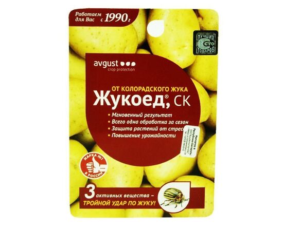 Жукоед – инновационный препарат от колорадского жука на картофеле, в состав которого входят три активных действующих вещества, принадлежащие к разным классам химических соединений, отличающихся по механизму действия и физическим свойствам: