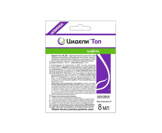 Цидели Топ (дисперсионный препарат) - комбинированный фунгицид, обладающий контактной, трансламинарной и фумигантной активностью для защиты плодовых и овощных культур от комплекса грибов-патогенов. Обладает длительной профилактической, лебной и остаточной активностью (до 30-40дней). Устойчив к смыванию дождём и высоким температурам.