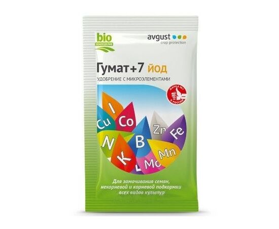 В удобрении Гумат +7 ЙОД семь минеральных добавок: азот, бор, цинк, марганец, молибден, железо. Семь микроэлементов сделали состав удобрения на основе гумата не только стимулятором роста, но и удобрением для почвы. Все эти минералы находятся в доступной для растений форме и легко поступают в клетки.