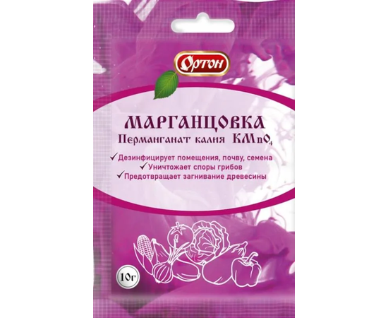 Марганцовка (перманганат калия) ОРТОН 10 г - популярный многофункциональный продукт. Применяется в качестве антисептического, антибактериального и обеззараживающего средства. В быту раствором марганцовки моют и протирают поверхности в помещениях, предназначенные для дальнейшего стерильного использования. Также используют для предохранения древесины от загнивания.