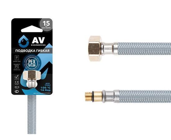 Гибкая подводка для воды от AV Engineering предназначена для подключения отдельного сантехнического оборудования к основной системе водоснабжения и изготавливается только из высококачественных материалов, что обеспечивает высокую эластичность и многолетнюю исправную работу. Технические характеристики: - Длина: 150 см - Концевая присоединительная арматура: накидная гайка 1/2" из никелированной латуни. - Максимальная температура: 100°С - Рабочее давление: 16 бар - Внутренняя трубка: PEX-b - Наружная оплётка из нержавеющей стали AISI-304 - Латунная иголка М10, короткая - Уплотнительное кольцо из EPDM - Обжимная гильза из нержавеющей стали AISI-304 с защитным слоем.