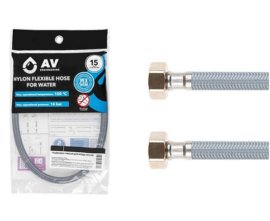 Гибкая подводка для воды nylon Lt гайка 1/2" - гайка 1/2" AV ENGINEERING - приспособление, позволяющее соединять два стационарных вывода воды, причем они (выводы) могут располагаться под любым углом и на любом расстоянии друг от друга. Подводка предназначена для подключения смесителя, бойлера, газового котла, унитаза к системе водоснабжения жилых и частных домов, промышленных предприятий. Отличается простотой монтажа, длительным сроком службы и универсальностью.