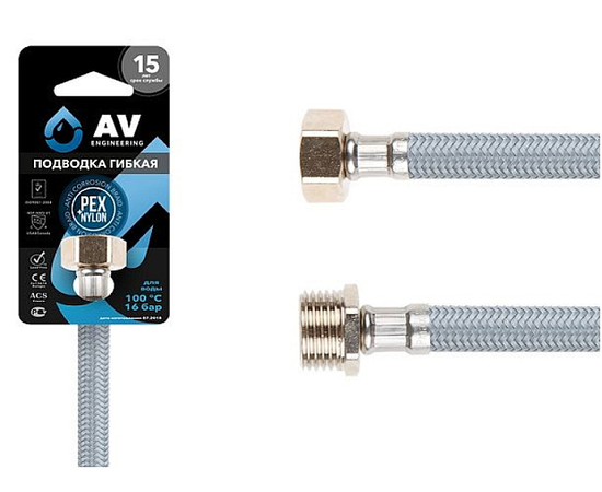 Гибкая подводка для воды nylon Lt гайка 1/2" - штуцер 1/2" AV ENGINEERING - приспособление, позволяющее соединять два стационарных вывода воды, причем они (выводы) могут располагаться под любым углом и на любом расстоянии друг от друга. Подводка предназначена для подключения смесителя, бойлера, газового котла, унитаза к системе водоснабжения жилых и частных домов, промышленных предприятий. Отличается простотой монтажа, длительным сроком службы и универсальностью.