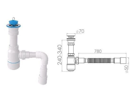 Сифон для умывальника с прикруч. выпуском 70мм , с гибкой трубой 1 1/2" - 40/50мм, AV Engine