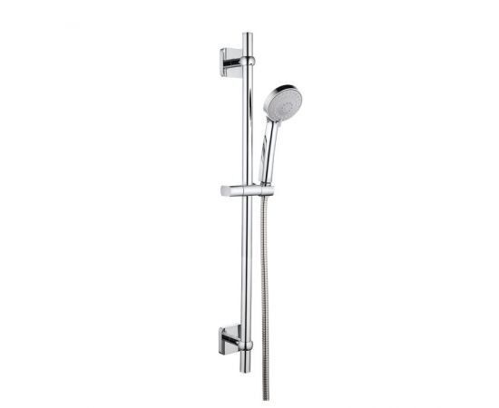 Душевой гарнитур. Стойка для душа, нержавеющая сталь с никель-хромовым покрытием, высота 650 мм, диаметр 22 мм. Оба крепления свободные. Держатель лейки из ABS-пластика, поворотное крепление, регулировка наклона лейки. Лейка для душа из ABS-пластика, диаметр 80 мм, 3 режима (Дождь, Массаж, Дождь&Массаж). Шланг для душа ПВХ в оплетке из нержавеющей стали, 1,5 метра, с системами Double Lock и Twist Free В комплекте: крепеж.