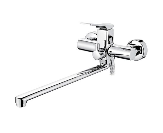 Смеситель для ванны с длинным изливом, дивертор в корпусе,водоразборное устройство, обеспечивающее смешение холодной и горячей воды, а также регулирование ее расхода и температуру потребителем.