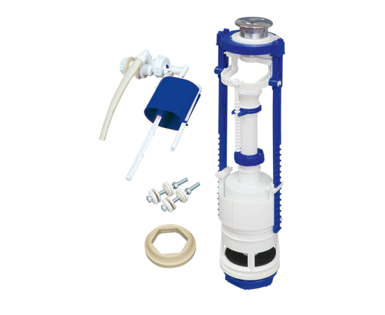 Арматура АС-11.1М кнопочная 2-х уровневая с универсальным клапаном боковой подводки воды. Данная арматура качественно отличается от штоковых арматур, при этом она включает в себя лучшие их качества. Арматура универсальная: устанавливается в "средние" бачки (высота до крышки бачка от 310 мм до 390 мм), и "высокие" (высота до крышки бачка 420 мм).