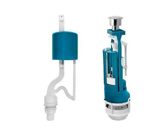 Комплект арматуры для бачка к унитазу. Универсальный сливной клапан СБ2м кнопочный с двумя режимами слива. Система "СТОП ПОТОК" - (для слива полного объема бачка необходимо нажать на большую кнопку смыва, для смыва строго необходимой части воды необходимо нажать и удерживать нужное время малую кнопку смыва).