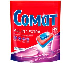 Таблетки для посудомоечной машины «Сомат» Всё в 1 Экстра, 45 штук – мультифункциональное моющее средство для идеальной чистоты вашей посуды. Таблетки удаляют самые сложные загрязнения от присохшей пищи, жира, налета от чая и кофе. Они быстро растворяются даже на коротких циклах, что...