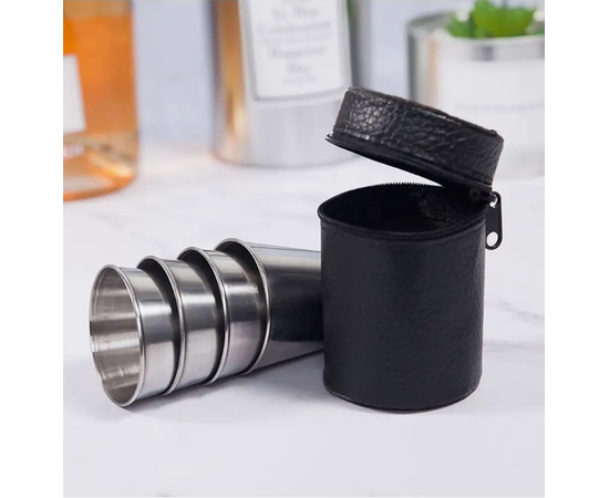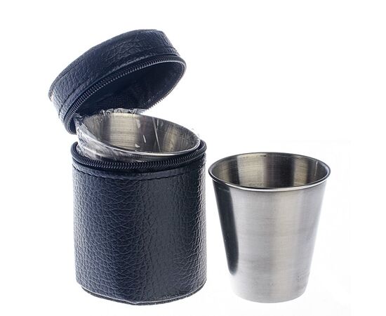 Металлические стаканы (4 штуки) в наборе, упакованы в кофр из кожзама, для походов и отдыха на природе, для подарка - емкостью 70 мл. Походный набор стаканов из качественной сверхпрочной матовой нержавеющей стали - незаменимый помощник на рыбалке, охоте, кемпинге с палатками или даче, туристическом походе, пикника, путешествия. Он не займет много места в поездке и поможет хранить все инструменты для загородного пикника организованно. Сталь нетоксична.