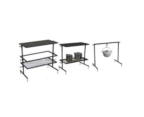В набор входит: стол-крыша, полка для гриля, полка для шампуров, полка для казана, цепь 50см, карабин. Изготовлен из проифильной трубы 20х20. Толщина стола 1мм. Вся конструкция разборная, можно комплектовать по желанию. Все элементы покрыты огнеупорной краской.