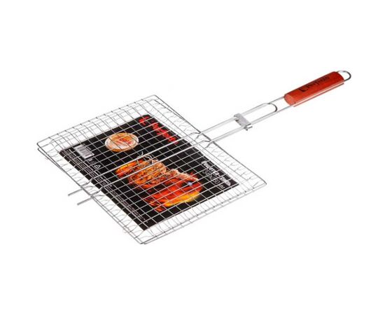 Деревянная вставка на рукоятке,предохранят от ожогов, удобна в руке и имеет эстетический привлекательный вид. Надежное кольцо-фиксатор предотвращает открытие решетки в процессе приготовления.