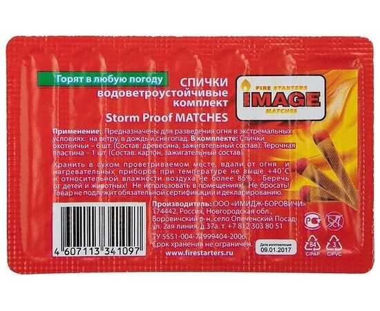 Ветроводоустойчивые спички Image предназначены для разведения огня в любую погоду. Горят в воде, на ветру, в дождь и снег. Более густой слой зажигательной смеси нанесён на две трети спички, что обеспечивает долгое горение в любых экстремальных условиях. Спички подходят для охоты, рыбалки и походов