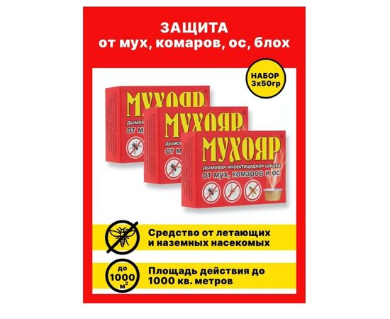 Дымовая инсектицидная шашка Мухояр от мух, комаров и ос, блох, пухо-пероедов, тараканов - 50г. Привычное средство против летающих насекомых в хлевах, дворовый и хозяйственных помещениях являются аэрозоли (типа дихлофоса). Но, при всей эффективности, они имеют ряд недостатков. При обработке помещений надо защищать органы дыхания и слизистые, т.к. велик риск вдохнуть ядовитые испарения. Дымовая шашка интенсивно дымит (но не горит!). Дымление происходит в течение 1-2 мин после поднесения спички, и человек успевает покинуть помещение. Дым проникает во все щели и уничтожает спрятавшихся там насекомых. Одинаково легко обработать как низкие, так и очень высокие помещения. Также средство от насекомых используется в отсутствие людей и животных в нежилых помещениях (животноводческих, в том числе птицеводческих, звероводческих и других сельскохозяйственных помещений в отсутствии животных, хранилищах, складах, подвалах, подсобных помещений, отдельно стоящих магазинов, ресторанов). А при уничтожении ос исключена опасность быть ужаленным. Остатки дыма полностью удаляются при проветривании.