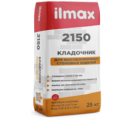 НАЗНАЧЕНИЕ: ilmax 2150 предназначен для кладки несущих и самонесущих конструкций из стеновых изделий пустотностью до 25 % и маркой по прочности на сжатие не менее М75, а также кладочных материалов с пустотностью более 25 % и маркой по прочности на сжатие не менее М150: керамический и...