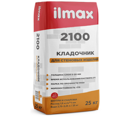 НАЗНАЧЕНИЕ: ilmax 2100  предназначен для кладки несущих и самонесущих конструкций из стеновых изделий пустотностью до 25 % и маркой по прочности на сжатие не менее М50, а также кладочных материалов с пустотностью более 25 % и маркой по прочности на сжатие не менее М100: керамический и...