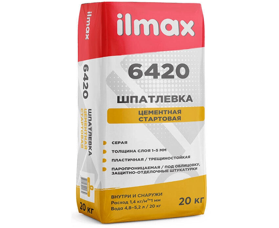 ilmax 6420 – шпатлёвка на основе цемента, минерального наполнителя и комплекса добавок. Пластичная консистенция растворной смеси обеспечивает удобонаносимость. Трещиностойкая, после высыхания образует гладкую и ровную поверхность, которая легко шлифуется.