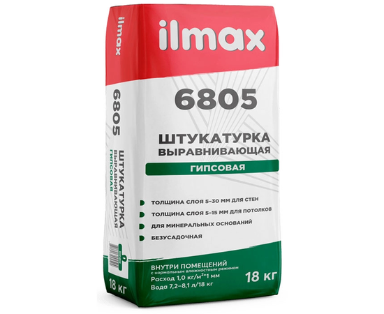 ilmax 6805 – выравнивающая штукатурка на гипсовом вяжущем с функциональными добавками после высыхания имеет плотную прочную поверхность, идеальную для выполнения шпатлёвочных работ. Материал безусадочный, что позволяет наносить его в широком диапазоне толщин и обеспечивать высокое качество отделки. Гипсовая штукатурка создает благоприятный микроклимат в помещении, экологически безопасна.