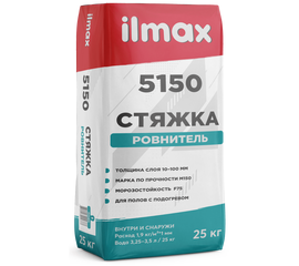 НАЗНАЧЕНИЕ: ilmax 5150 / 5150 ЗИМА предназначена для создания стяжки пола (адгезионно связанной или на разделительном слое) под последующее выравнивание самонивелирующимися составами, облицовку и укладку напольных покрытий, а также для формирования уклонов. Не является финишным покрытием....