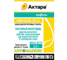 Инсектицид Актара ВДГ, 1.2 г  - препарат широкого спектра для уничтожения листогрызущих и сосущих насекомых. Не теряет свою эффективность при низких температурах, повышенной влажности, обладает устойчивостью к инсоляции. Предусмотрено наземное распыление (срок защиты 14-28 дней) и полив в почву...