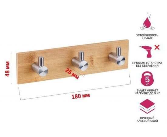 Планка самоклеящаяся 3 крючка PEGASUS, нержавеющая сталь/бамбук, карт.уп., PERFECTO LINEA