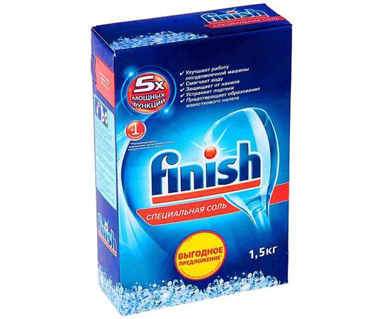 Специальная соль Finish эффективно смягчает Вашу воду и улучшает работу Вашей посудомоечной машины, усиливая действие моющего средства и удаляя белый налет и следы подтеков на Вашей посуде.