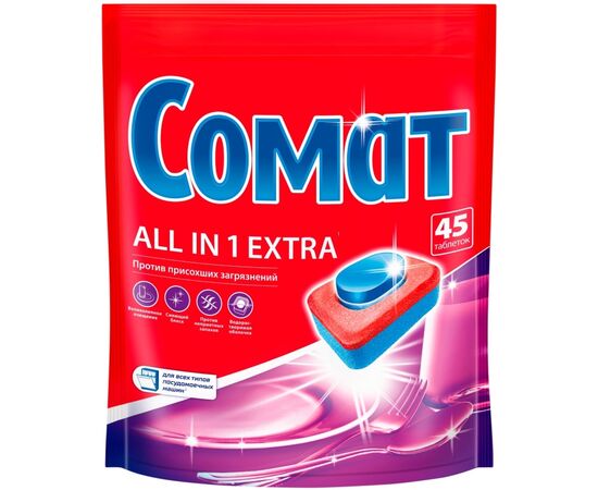 Таблетки для посудомоечной машины «Сомат» Всё в 1 Экстра, 45 штук – мультифункциональное моющее средство для идеальной чистоты вашей посуды.