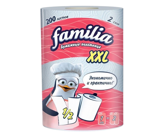 Полотенца бумажные FAMILIA XXL 1 рулон выполнены из 100% целлюлозы, подарят превосходный комфорт и ощущение чистоты и свежести. Бумажные полотенца просты в использовании, их не надо стирать и просто утилизировать. Безупречно белые, они подчеркивают чистоту вашего дома и вашу искреннюю заботу о близких. Специальное тиснение улучшает способность материала впитывать влагу, что позволяет полотенцам еще лучше справляться со своей работой. Изделия отрываются по специальной перфорации. Также можно использовать лишь 1/2 листа полотенца для наибольшей экономии и практичности.
