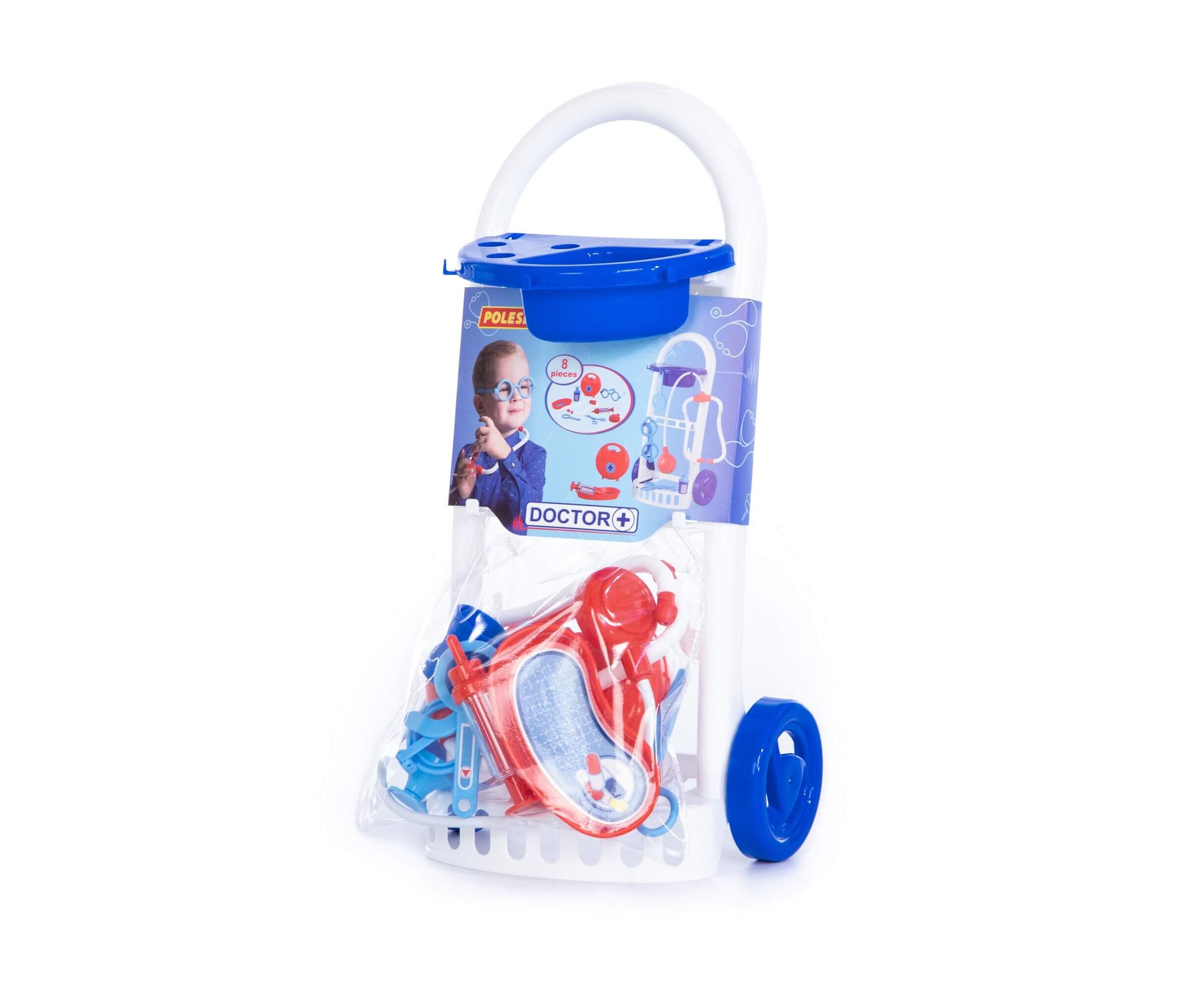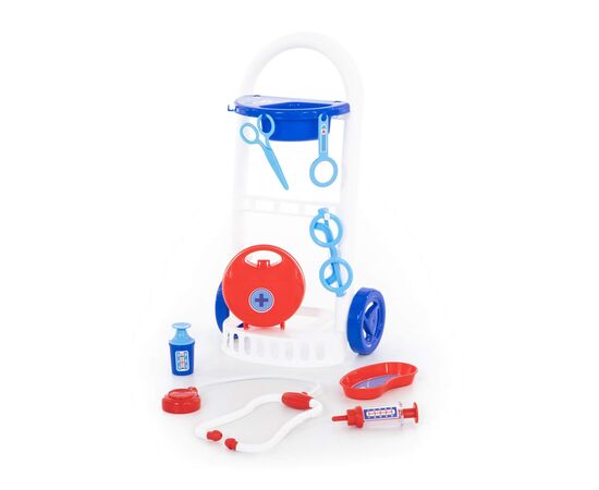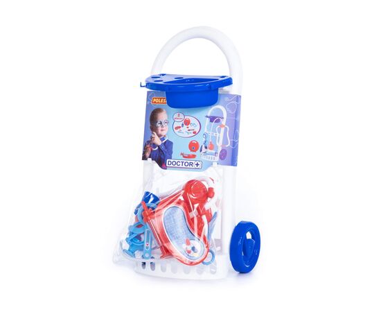 Набор "Доктор №11" от фабрики «Полесье» на тележке мобилен и удобен в перемещении, благодаря этому малыш сможет быстро оказать помощь своим пациентам. В этом ребёнку помогут безопасные игрушечные принадлежности: ножницы, очки, лупа, шприц, лоток для инструментов, стетоскоп (для прослушивания сердца и лёгких), баночка с крышечкой, медицинский чемоданчик. Возможно, именно с этого набора у будущего врача начнется любовь к медицине.