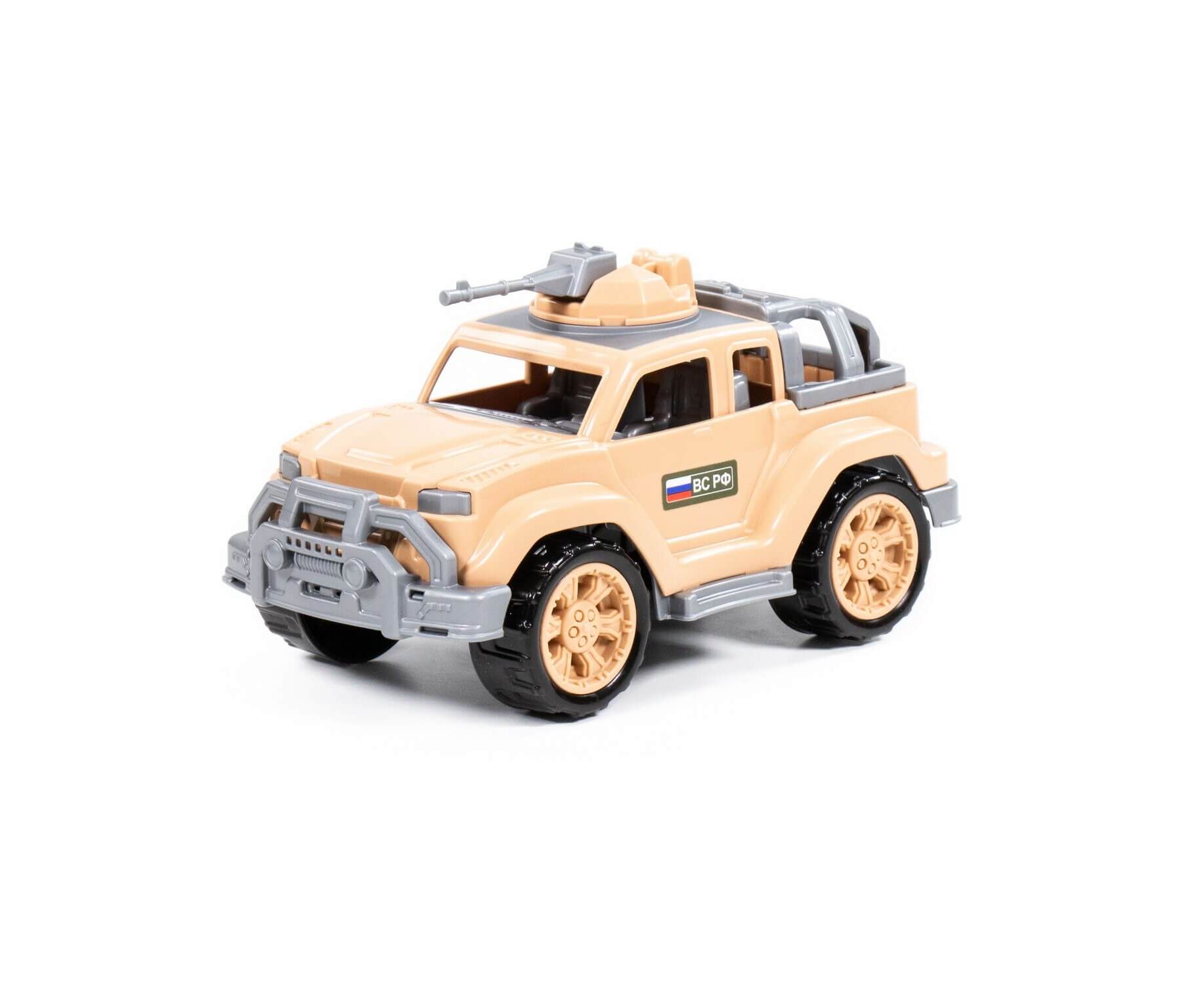 Игрушка имеет реалистичный дизайн, округлую форму деталей. Автомобиль-джип военный-сафари «Легионер-мини» с одним пулемётом изготовлен в бежевом цвете, имеет вместительный багажник, на крыше автомобиля установлен пулемёт (его можно вращать).