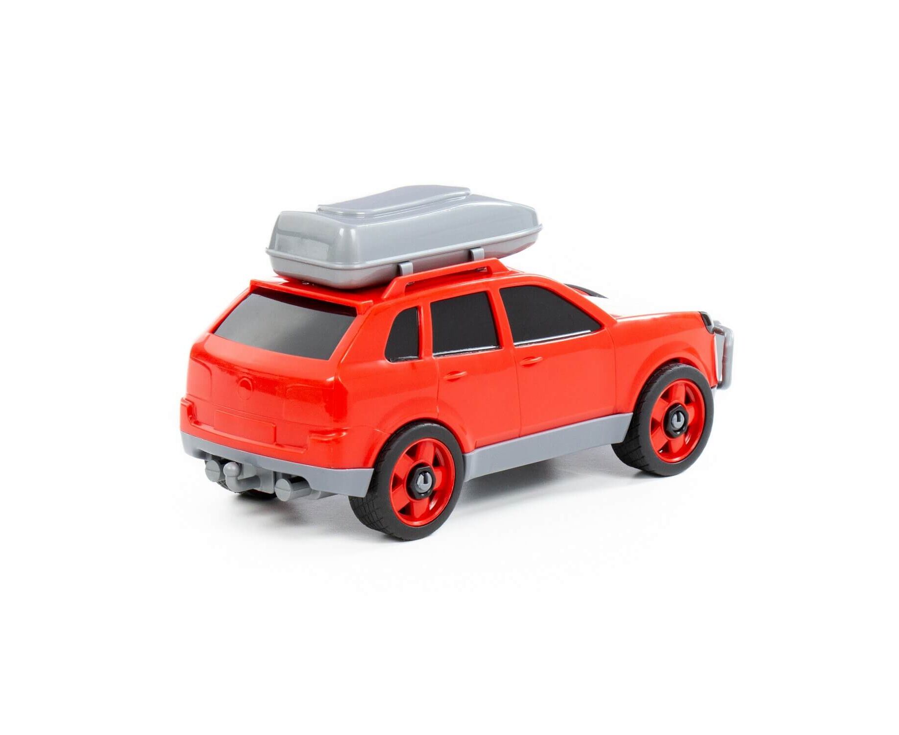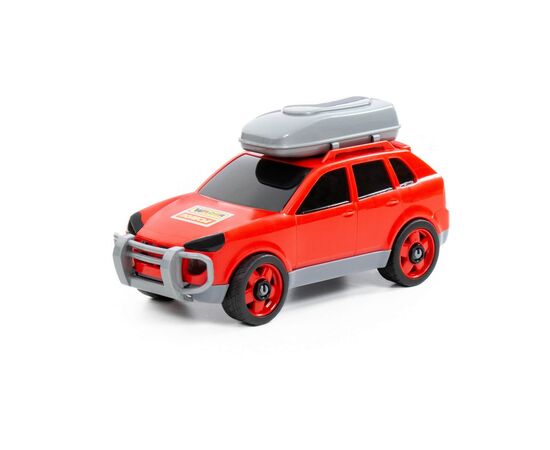 Лаконичный дизайн, тонированные стекла, багажник на крыше и защита на бампере, говорят о том, что игрушечный легковой автомобиль от компании «Полесье» создан для приключений.