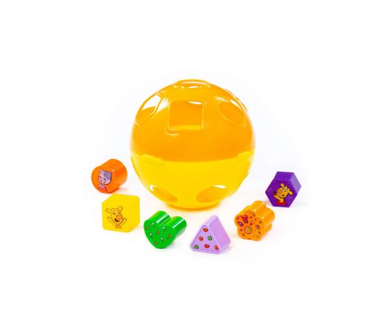 Шар «Оранжевая корова» - развивающая игрушка для детей от 1 года. На поверхности игрушки расположены отверстия разной формы, в которые нужно поместить подходящие фигурки. В комплекте 6 фигур (круг, квадрат, треугольник, многоугольник, цветочек и сердечко). Для того, чтобы достать фигурки обратно – нужно раскрыть шар. Продается игрушка в сеточке.