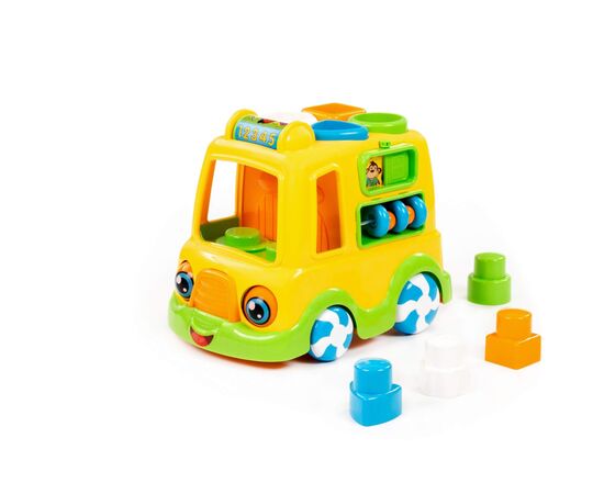 На боковых стенках фургончика расположены развивающие элементы: счеты, шестеренки, слот с различными изображениями и окошко со створкой.
