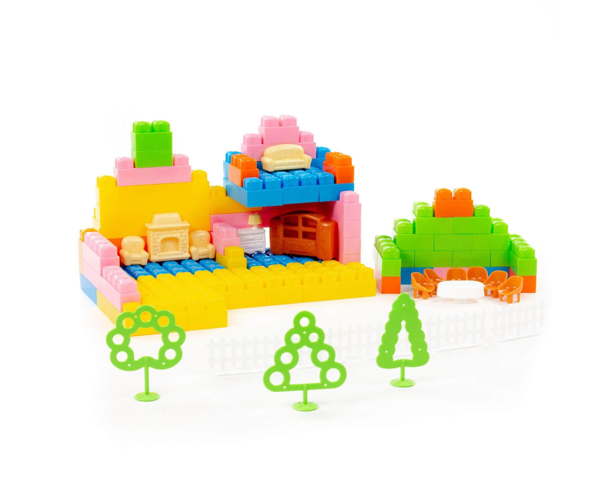В данный набор входит миниатюрная мебель из пластика, поэтому ребёнок может не только строить домики, но и обустраивать их.
