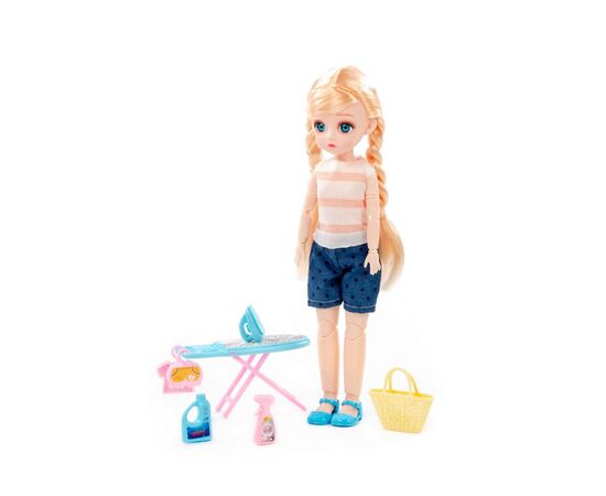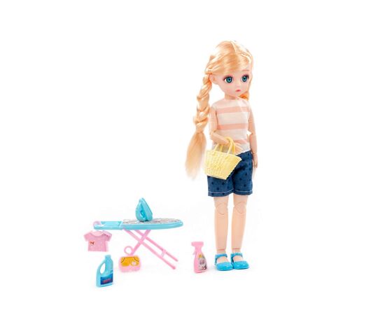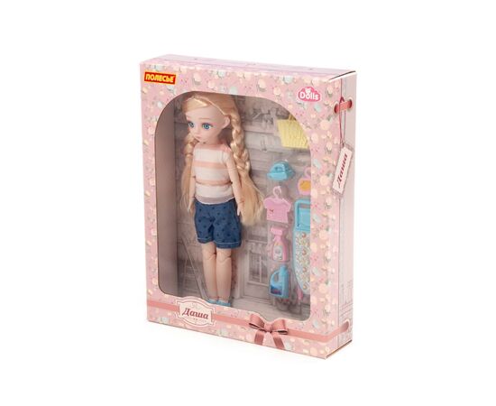 Кукла «Даша» с аксессуарами – прекрасный подарок для девочек. Игрушка имеет выразительный взгляд, стильную прическу и интересный наряд. Руки, ноги и голова куклы могут принимать практически любую естественную человеческую позу благодаря наличию 13 точек артикуляции. Эти особенности игрушки дают ребенку больше возможностей и позволяют управлять куклой, делая игру более разнообразной и интересной. В наборе с игрушкой идут игрушечная сумочка, утюг, гладильная доска, имитация одежды на вешалках, игрушечные моющие средства для уборки и стирки, благодаря которым ребенок может придумать множество необычных и интересных сценариев. Игра с куклой «Дашей» помогает малышу развивать воображение, мелкую моторику, пространственное и ассоциативное мышление. Проигрывая различные ситуации, ролевые модели, ребенок получает возможность развития своих коммуникативных навыков, получает представление о домашних обязанностях.
