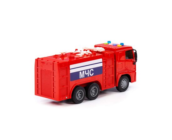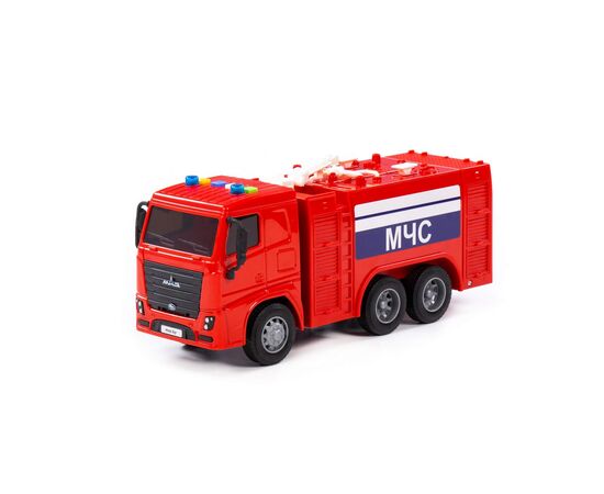 Автомобиль-пожарный изготовлен по лицензии Минского автомобильного завода МАЗ. Игрушка многофункциональная: имеет подвижные элементы и детализированную конструкцию, благодаря чему ребенок сможет наглядно познакомиться с функциями данного вида спецтехники. На кабине имеется 4 кнопки управления звуковыми и световыми сигналами. Машинка оснащёна инерционным механизмом.
