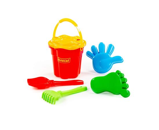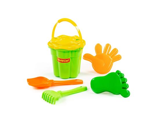 Ведро-цветок среднее №3, ситечко-цветок среднее №3, лопатка №5, грабельки №5, формочки (ладошка + ножка)